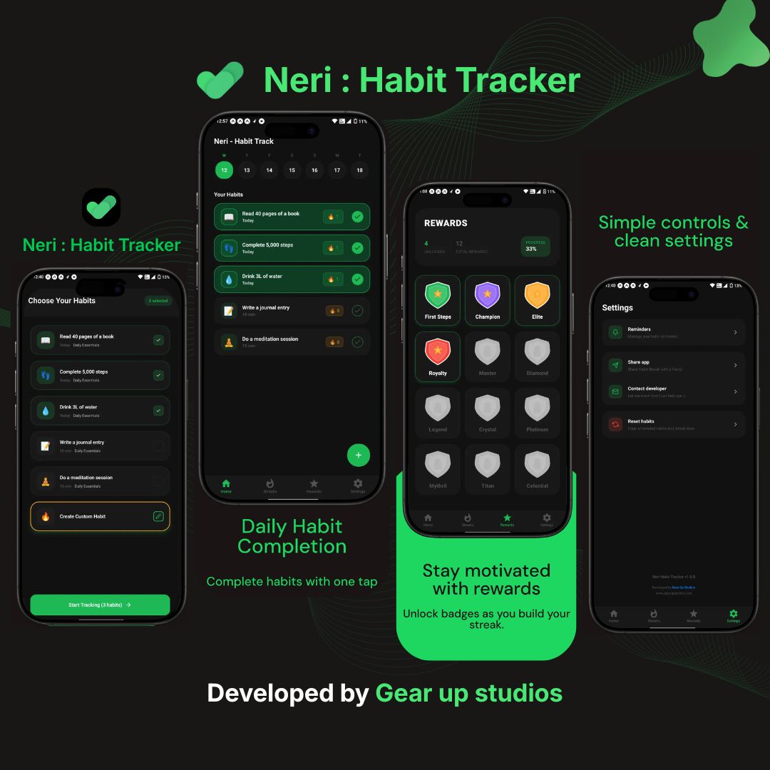 Neri is a habit tracking mobile app designed to help users build strong daily routines through habit completion, streak tracking, and reward badges. The app offers a clean dark UI with simple controls and motivational progress rewards.